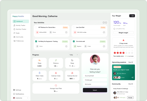 Happy Huddle is a wellness-focused web app designed to help users monitor key health metrics and form better lifestyle habits. The challenge was to create a mobile-first experience that felt motivating, not overwhelming, especially when dealing with daily health data and behavioral tracking. The product needed to be accessible for first-time health app users while encouraging consistency through positive reinforcement.